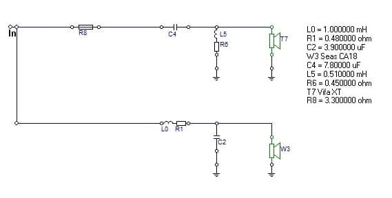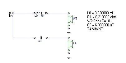 Once again, since we flattened the impedance curve of the tweeter, we are going to recalculate the values of the components from the tweeter section. This time we are going to use the DC resistance values instead (Re = 3 Ohms) :