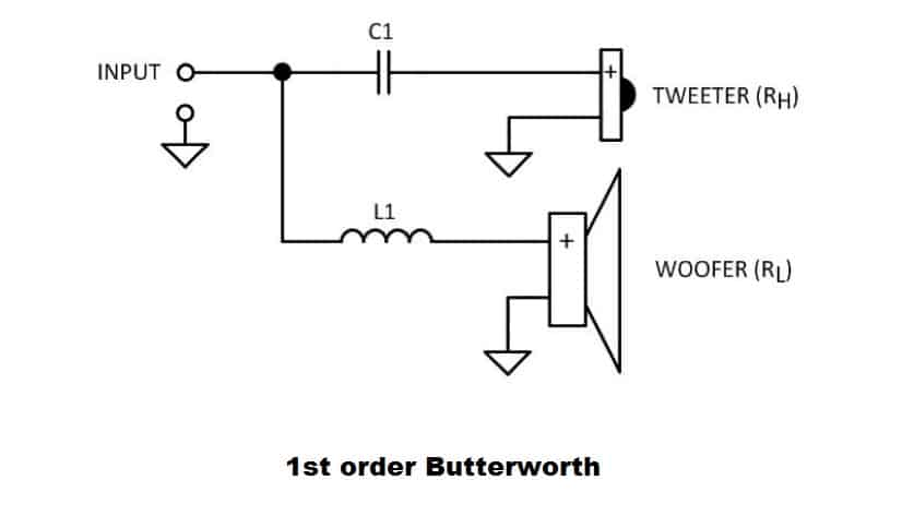 If you are not familiar with passive crossovers for speakers, I suggest you go ahead and read on how they work and take a look at the circuit schematics for each type. Like I said earlier, we are going to focus on a 1st order Butterworth filter, and a 2nd order Linkwitz-Riley. To put all information in one pot, here is, once again, the schematics and the component formulas for each of the 2 crossover types. If you don’t understand what the letters stand for, make sure you read the articles linked previously.