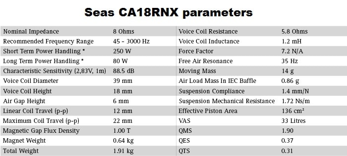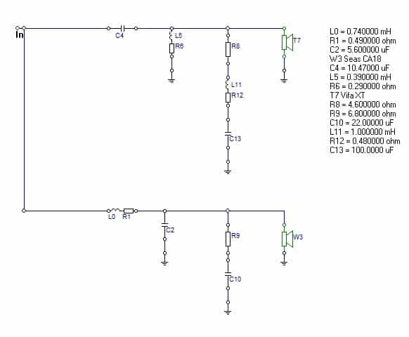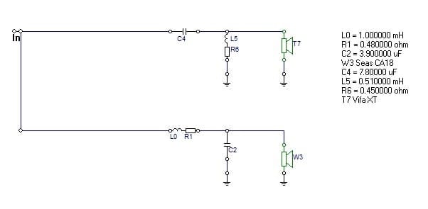 I will take each crossover design and measure the frequency response. After that, we can compare them and draw a conclusion. To generate the response curves, I’m going to use a Seas CA18RNX (Amazon affiliate paid link) mid-bass driver in a bass reflex enclosure tuned at 52 Hz, and a Vifa XT25TG30-04 (Amazon affiliate paid link) tweeter.