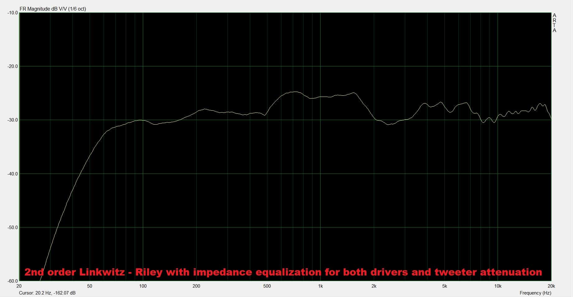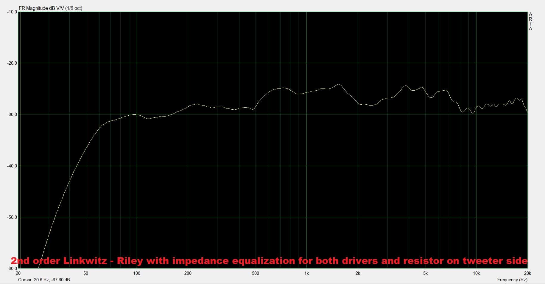 The response looks a bit more linear now. However, let’s try to move the resistor close to the tweeter, see how that affects the frequency response. So, here is the diagram again :