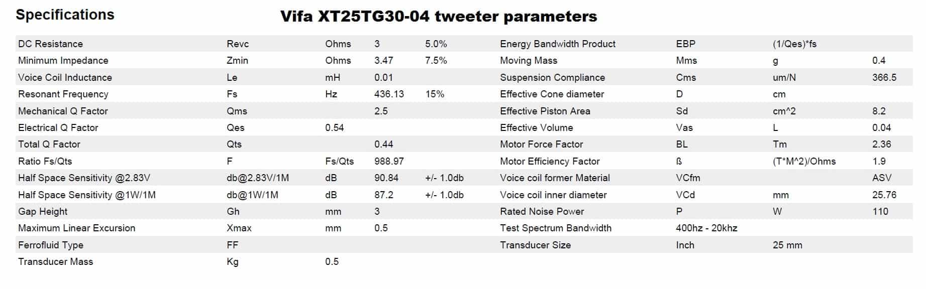 Normally, you would have to choose a crossover point, but before we do that, let’s look at the efficiency of the drivers. In most cases, the tweeter is louder than the mid-bass driver and needs attenuation. Since we don’t have any measuring equipment, we need to rely on the specification sheet. We are looking for the efficiency at 1 watt / 1 meter. If it’s quoted at 2.83 V we need to transform it.