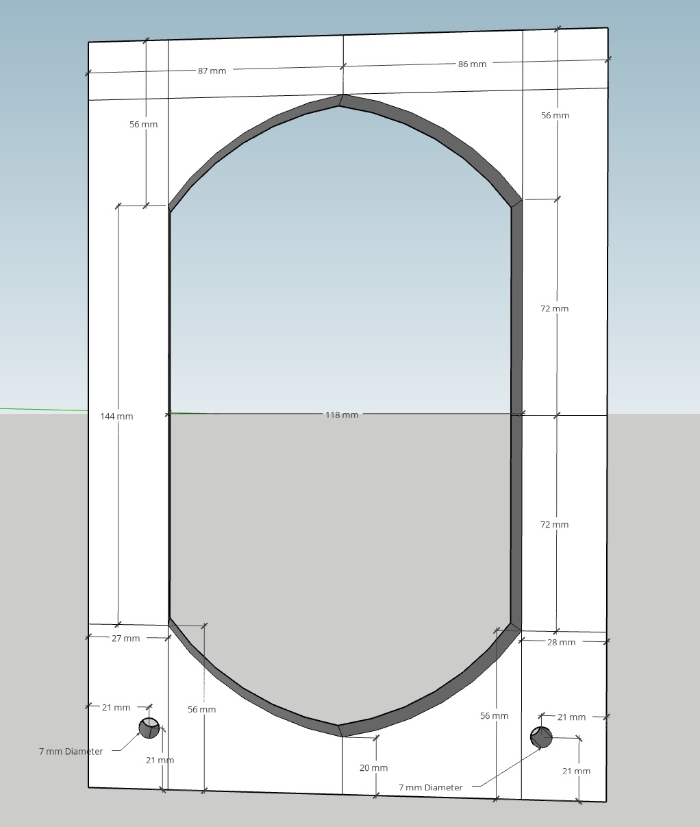 This is where the active speakers will go. The dimensions are in mm, but I also included the dimensions in inches, as I use the Jasper circle jig, for circle cutouts. Also, the front baffle is chamfered along the edges. Now, if we take a look at the back panel.
